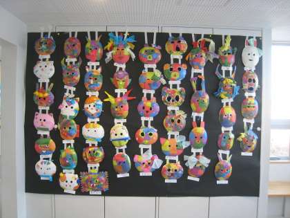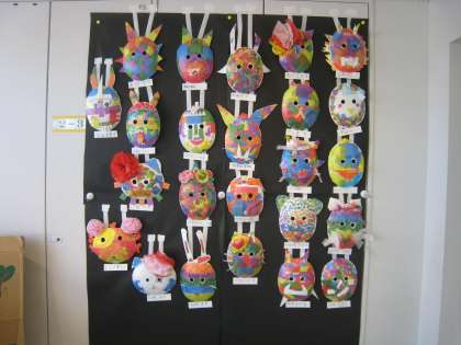 2年生の教室前オープンスペース壁面に図工作品を展示しています。題材名は「かぶって へんしん」、子供たちは思い思いの顔をイメージしてお面を作りました。