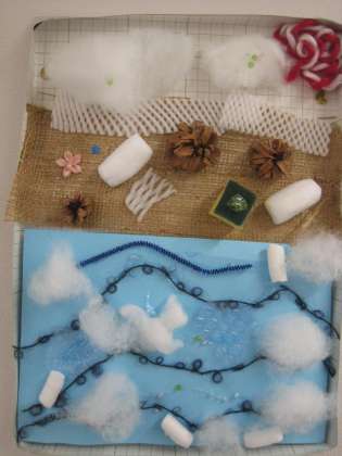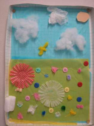 図工室前の廊下壁面に3年生が作った作品を展示しています。題材名は「さわってわくわく」、子供たちは様々な手触りの素材を用意してイメージを広げながら画面に素材を貼り合わせてコラージュ作品を作りました。