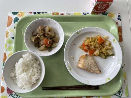 献立 ごはん めかじきの照り焼き 白菜のポン酢和え 根菜の煮物 牛乳