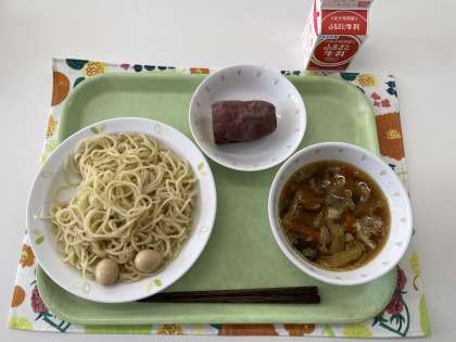 献立 中華つけ麺 煮卵 焼き芋 牛乳