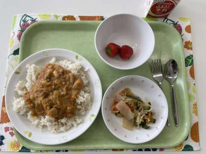 献立 フェイジョアーダこんにゃくサラダ いちご 牛乳