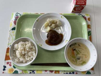 献立 ごはん ハンバーグ 粉ふき芋 豆乳みそスープ 牛乳