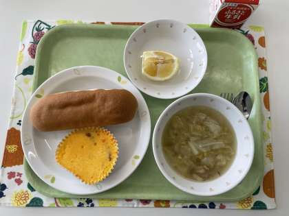 献立 米粉パン レンズ豆とキャベツのスープ ミートオムレツ はるか 牛乳