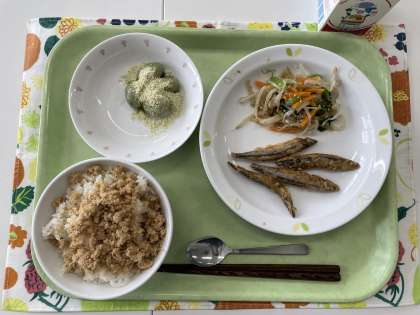 献立 七分つきご飯 ツナそぼろ きびなごの唐揚げ 和風ナムル 若草団子 牛乳