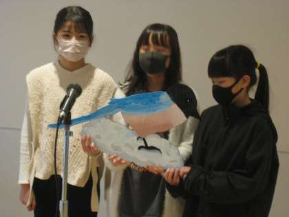 まんがイラスト・アートクラブの4年生(1名は来年度の希望者)が階段の名称を分かりやすく伝えるために「おなが階段」(東側階段)のイラスト表示を作製し、工夫した点や苦労した点を修了式後にテレビ放送で発表しました。階段周辺に掲示しますので、ご来校の際にはぜひご覧ください。