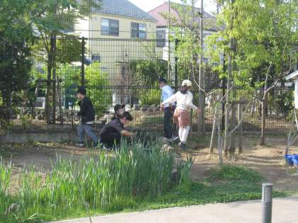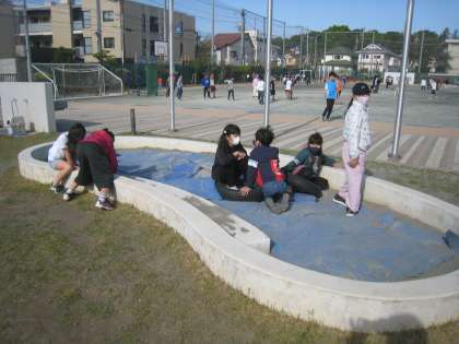 子どもたちは、せせらぎや砂場で植物を観察したりおしゃべりをしながら過ごします。