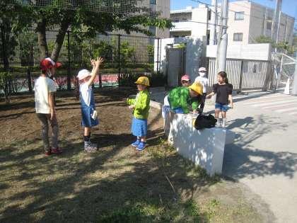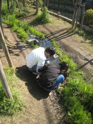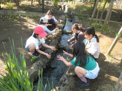 子どもたちはせせらぎで小さな生き物や植物を観察しています。