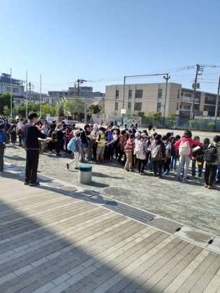 よい天気のもと、3年生、4年生が遠足に出発します?