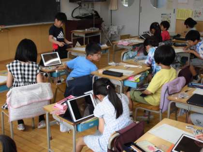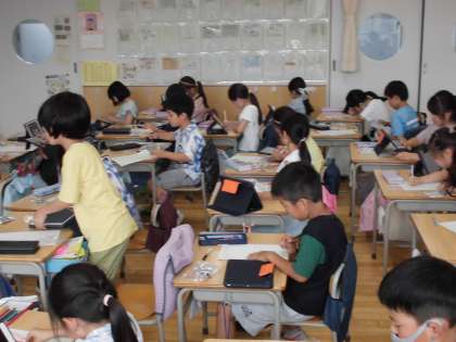 2年生は生活科でミニトマトの種の「形・色・大きさ・におい」などをタブレット端末のカメラ機能を使って観察しました。カメラで拡大すると細かい部分まで見ることが出来ました。