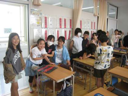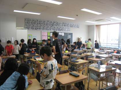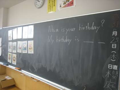 5年1組の授業風景を紹介します。英語の授業で「あなたの誕生日はいつですか?」といいう先生の質問に対して子どもたちが答える学習です。誕生日月の順番に並んでいます。