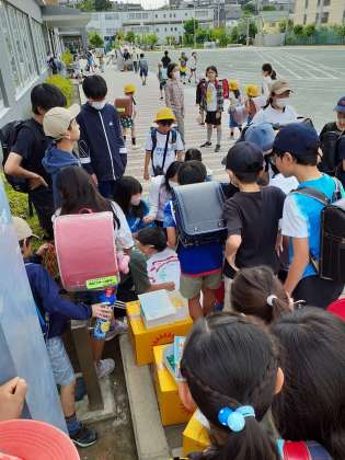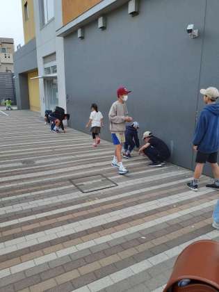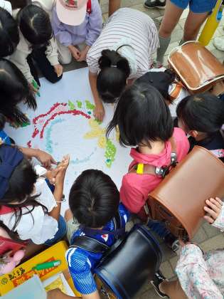 6年生の呼び掛けで始まったちぎり絵ですが突然の呼び掛けにもかかわらず、たくさんの子どもたちが集まってくれました。紙が風に飛ばされるハプニングもありましたが、子どもたちが声をかけあって、みんなですべて拾いきりました。