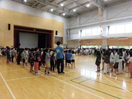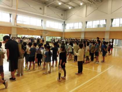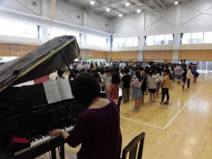6月22日、4年ぶりに体育館に全校児童が集まり、音楽朝会を行いました。曲目は「大きな歌」、子どもたちの大きな歌声が体育館に響きました。