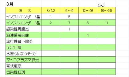 3月の“感染症発生状況”と“かぜ症状による欠席状況”をご報告いたします。