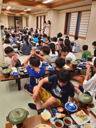 温泉に入り、お腹もペコペコです。みんなで食べるごはんも、給食の時とはまた違った美味しさがあるようです
