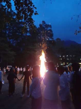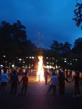 火の神から城山小のみんなに命の火が渡されました。いよいよキャンプファイヤーのはじまりです!