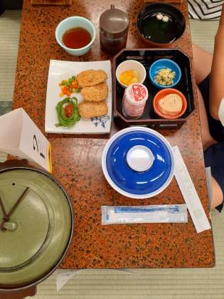 湯滝でお昼ごはんを食べて湯ノ湖まで歩く予定でしたが、天気が急変し雷がなり出したので宿に戻ってお弁当を食べました。お風呂も早く準備をしてもらい、夕飯になりました。