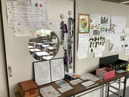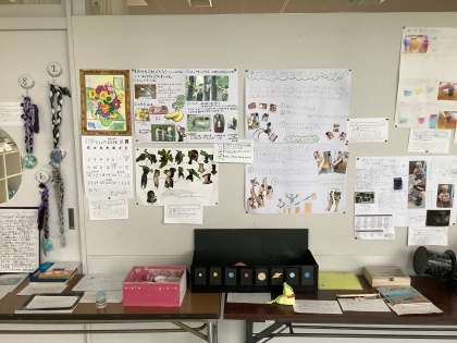 自由研究が勢揃いしました。どれも見応えのある作品ばかりです。子どもたちは、互いの作品を見合いっこして、作った時の苦労話やどのように扱えばいいのか話していました。