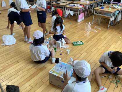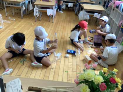 家から持ち寄った様々な材料を使ってどんな遊びができるか材料に触れながら色々考えていました。