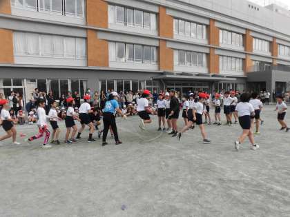 10月14日、金木犀の香り漂う秋晴れのスポーツ日和、長縄跳び大会を行いました。子どもたちはスポーツの秋を満喫しながらクラス目標達成のために精一杯頑張りました。目標を達成できたクラスがあり、残念ながら目標回数に届かなかったクラスもありました。今までの努力を糧として今後の学校生活に生かしてほしいと思います。参観していただいたたくさんの保護者・地域の皆様、ありがとうございました。