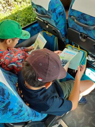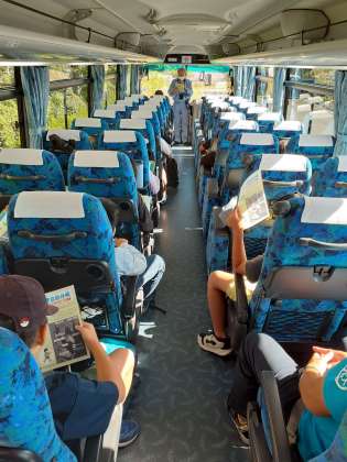 中央防波堤に着きました。見学の前に、バスの中で係の方から見学場所の学習を受けています。