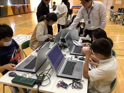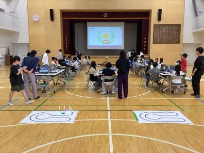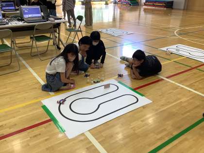 笑顔と学びの体験活動プロジェクトとして、マイコンレーサープログラミング教室を行いました。一人一台準備されたマイコンレーサーのプログラミングを行いました。どのようにプログラミングすれば走るのか試行錯誤を重ね、学習の最後には誰のマイコンレーサーが一番速いかタイムレースを楽しんでいました。