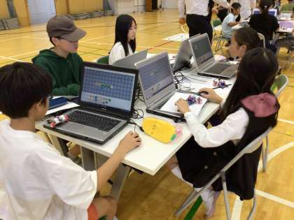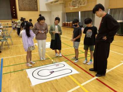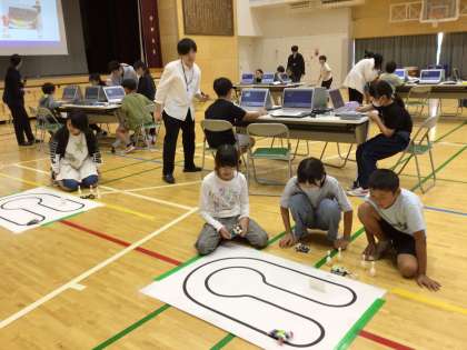 笑顔と学びの体験活動プロジェクトとして、マイコンレーサープログラミング教室を行いました。一人一台準備されたマイコンレーサーのプログラミングを行いました。どのようにプログラミングすれば走るのか試行錯誤を重ね、学習の最後には誰のマイコンレーサーが一番速いかタイムレースを楽しんでいました。