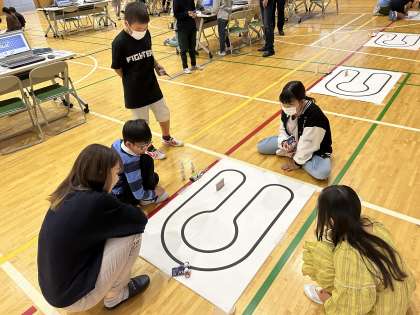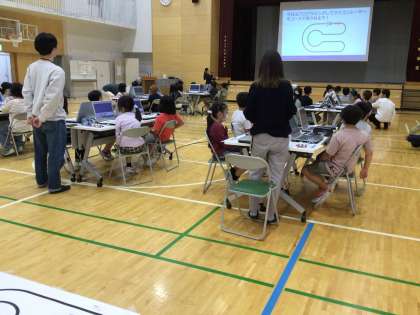 総合的な学習の時間に、「マイコンレーサープログラミング教室」を行いました。パソコンでプログラミングを行い、マイコンレーサーのタイムを競いました。いかに無駄ない動きをするか試行錯誤して、プログラミングをしました。
