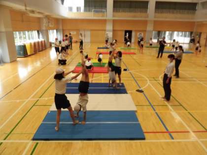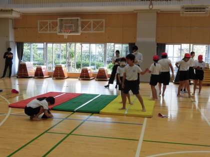 10月25日、本年度の校内研究会の主題「体育科におけるせたがや探究的な学びの実践」に基づき4年2組対象に研究授業を実施しました。「マット運動」の単元で回転系や技巧系の基本的な技を習得することを目標とし、グループで練習することを通して互いに自分の課題を見出し、解決するという探究的な学習を深めました。子どもたちは協力し合い、シンクロマットや個人練習に励んでいました。