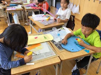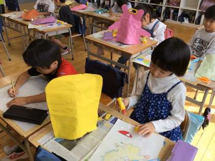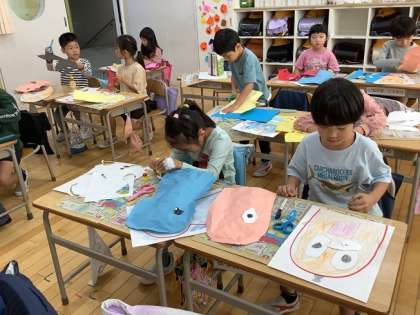 題材「あたらしいおともだち」に取り組んでいる様子です。「こんなお友だちがいたらいいな」というイメージから発想を広げました。たくさんの色画用紙を切ったり貼ったりしながらたくさんの不思議なお友だちが出来上がりました