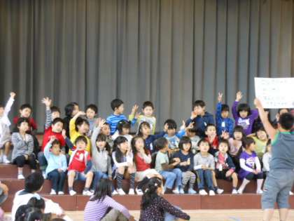4月21日 1年生を迎える会がありました。6年生が1年生一人一人の名前とプロフイールを紹介して、迎える会が始まりました。運営委員会が在校生から募集したクイズを使って雰囲気を盛り上げました。