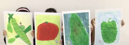 題材「おおきくそだて、びっくりやさい」で好きな野菜が大きく育つ様子を絵に表しました。
