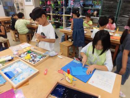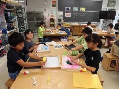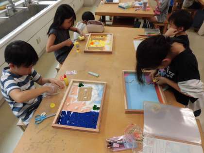 材料の触り心地を楽しみながら組み合わせ方を工夫して題材「さわってわくわく」を作っている様子です。子どもたちはイメージを広げながら材料をコラージュして平面作品をつくりました。