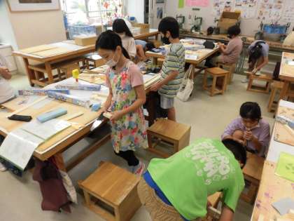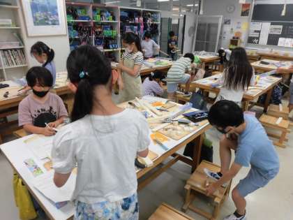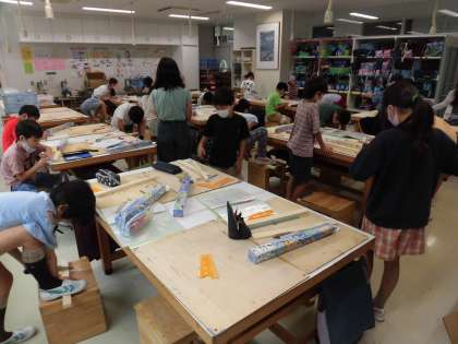 角材や板を接合してできる形から動く仕組みを考え、木工作品を作りました。作品に合う配色を考えて色も塗りました。