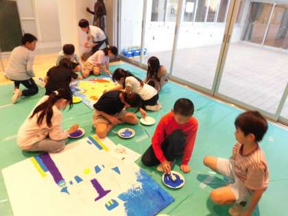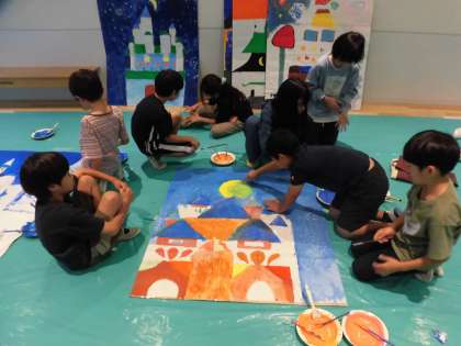 3年次に班ごとに描いた下絵をもとに共同製作「私たちの夢のお城」をクラスごとに4枚づつ選び、皆で協力しながら描きました。様々なイメージのお城の絵が仕上がったので展覧会の会場でぜひご覧になってください。