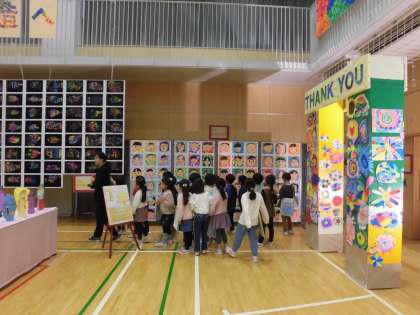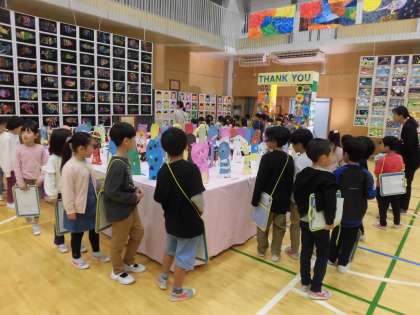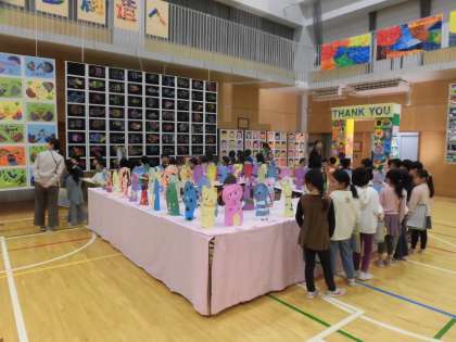 11月17日、展覧会2日目、児童鑑賞日でした。1年生は初めての展覧会ということもああり、美術館のような体育館の様子に圧倒されていました。クラスごとに各学年の作品をじっくり鑑賞することができました。