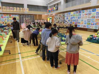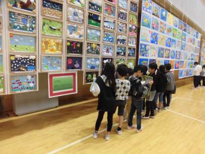 11月17日、展覧会2日目、児童鑑賞日でした。2年生にとって初めての展覧会ということもああり、美術館のような体育館の様子に圧倒されていました。クラスごとに各学年の作品をじっくり鑑賞することができました。