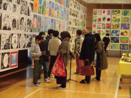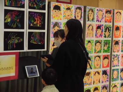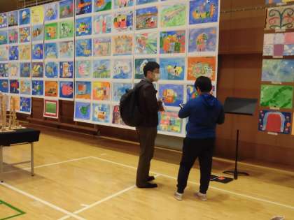 11月18日、1・2校時に6年生による展覧会ガイド活動を行いました。6年生は、展示されている作品についてより見方を深めていただくために、学年ごとの題材について調べ、まとめたことを分かりやすく伝えるために原稿を作りました。子どもたちは説明したことに対して感謝されたことが大いに励みになったようです。