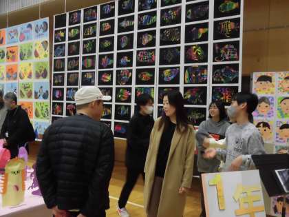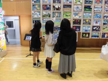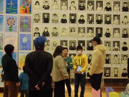 11月18日、1・2校時に6年生による展覧会ガイド活動を行いました。6年生は、展示されている作品についてより見方を深めていただくために、学年ごとの題材について調べ、まとめたことを分かりやすく伝えるために原稿を作りました。子どもたちは説明したことに対して感謝されたことが大いに励みになったようです。