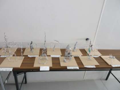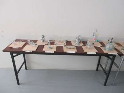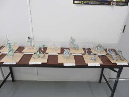 図工室前の廊下に5年生が制作した「ワイヤーアート」を展示しています。針金を曲げたりつないだりすることからイメージを広げ、抽象的な表現または具象的な表現で針金を素材とした立体作品を作りました。保護者・地域の皆様、学校にお越しの際はぜひご覧になってください。
