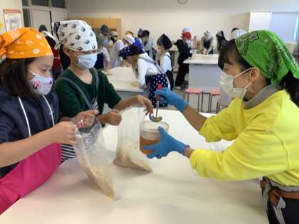 5年生は家庭科「食べて元気!ご飯と味噌汁」の学習の一環で味噌造りに挑戦しました。小泉麹屋の方に教えていただきながら、煮豆をつぶしたり、米麹と混ぜたりしました。混ぜ合わせる前には煮豆と米麹の味見もし、初めての体験にドキドキしながらも学びが深まったようです。