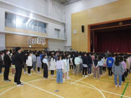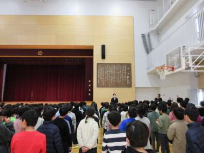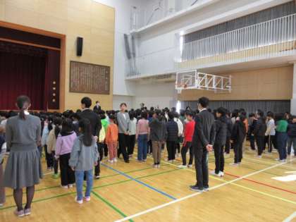1月9日、冬休みが終わり3学期が始まりました。始業式の中で、校長先生は能登半島地震で被災されている方々に配慮した話、MLB大谷翔平から寄贈されたグローブの紹介、夢を追いかけることの大切さなどを話しました。2年生代表児童の言葉、校歌斉唱では、子どもたちが新たな気持ちで新学期を迎えたことが伝わってきました。保護者・地域の皆様、本年も学校運営にご理解・ご協力をよろしくお願いいたします。