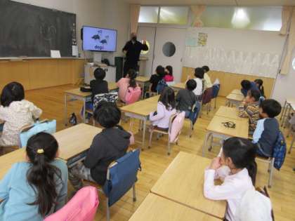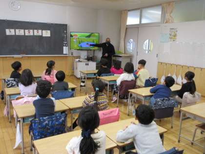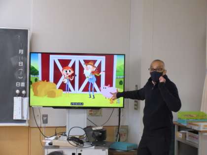 1月11日、1年生の授業風景を紹介します。子どもたちは外国語活動の時間にALT講師の先生から楽しく英語を習っていました。基本的な発音練習やビデオ教材などで子どもたちが興味をもつように工夫された授業で、あっという間に1時間が過ぎました。