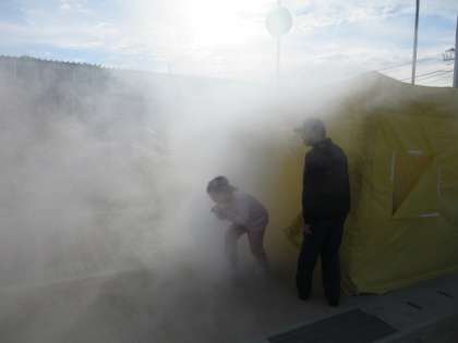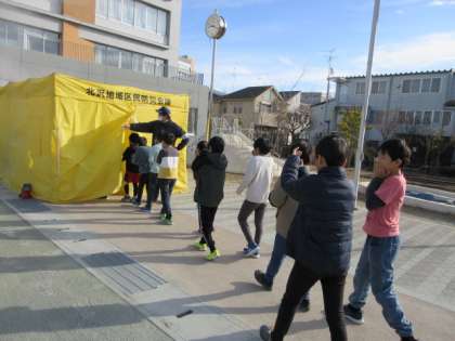 火災を想定した避難訓練にともない全校児童を代表して3年生が発煙車による「煙体験」を行いました。煙が充満した室内では歩行が困難になる、前方が見ずらくなるなどを実際に体験し、火災の怖さを改めて感じているようでした。煙体験を担当してくださったのは北沢総合支所災害対策本部の職員の方たちです。