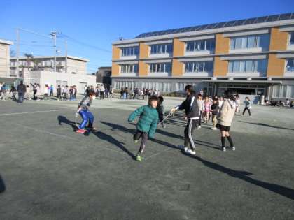 1月25日、朝の活動時間にわくスポ(長縄の記録会)に取り組みました。子どもたちは寒さに負けず、クラスの目標回数をクリアするために頑張って跳びました。