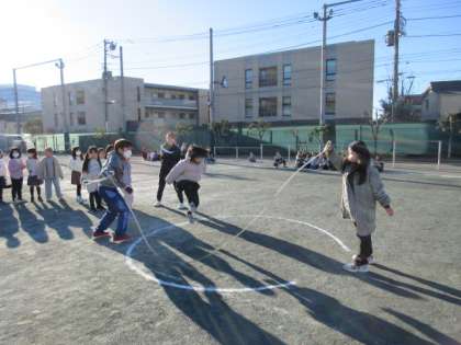 1月25日、朝の活動時間にわくスポ(長縄の記録会)に取り組みました。子どもたちは寒さに負けず、クラスの目標回数をクリアするために頑張って跳びました。