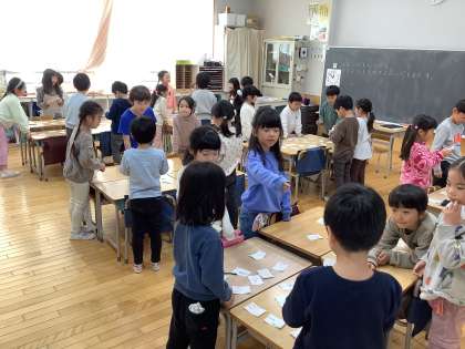 読み札に合う絵札を取ろうと、友達が読む声に真剣に耳を傾けました。