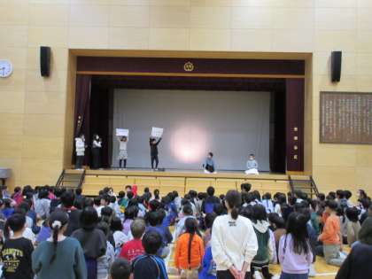2月22日、朝の活動時間に集会委員会による児童集会を行いました。内容はスクリーンに先生方のシルエットを写し、誰かを当てる「シルエットクイズ」です。5人の先生方が協力し、子どもたちは大いに盛り上がりました。