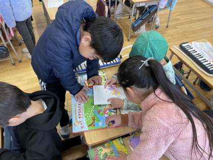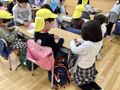 体育館で発表会をした後、教室では、1年生が作ったメニュー表を見ながら保育園生がやりたいことを決め、体験活動をして楽しみました。