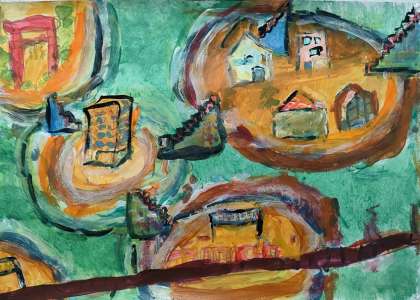 5年生が図工授業で制作した絵の題材「あったらいい町、どんな町」の作品を紹介します。子どもたちは「行ってみたい」「住んでみたい」と思う実際にはありえない町を思い浮かべて想像を膨らませながら様々な技法を使ってアクリル絵の具で描きました。ホームページのみでの紹介になりますが、イメージを広げてご覧になってください。