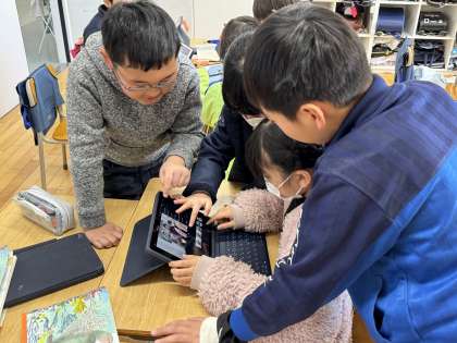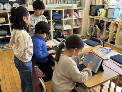 3年1組の子どもたちが国語の授業で単元「わたしたちの学校じまん」に取り組んでいる様子を紹介します。学校のいいところを新1年生に紹介するために班ごとに調べ学習に取り組み、楽しく学習しました。